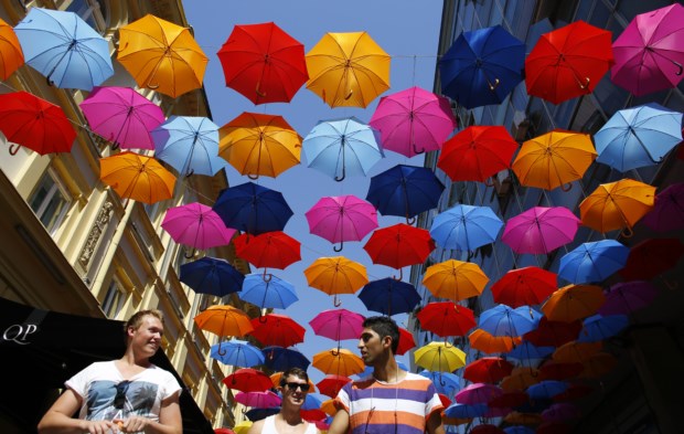 SÉRVIA, 29.7.2013. Rua da baixa de Belgrado decorada com chapéus-de-chuva Marko Djurica / Reuters