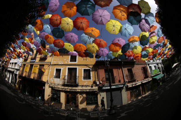 ESPANHA, 1.8.2013. Uma céu de guarda-chuvas em Getafe, perto de Madrid - um projecto assinado pela equipa portuguesa que criou um céu de chapéu-de-chuvas em Águeda (foto com olho-de-peixe) Juan Medina/Reuters