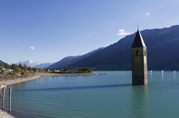 ITÁLIA, 2.8.2013. Uma torre no centro do lago Reschensee em Graun Dominic Ebenbichler/Reuters
