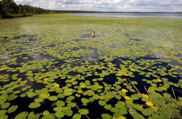 Um voluntário descansa num lago após participar na construção de um dique num pântano perto da remota aldeia de Luzhki, a 220km de Minsk Vasily Fedosenko/Reuters