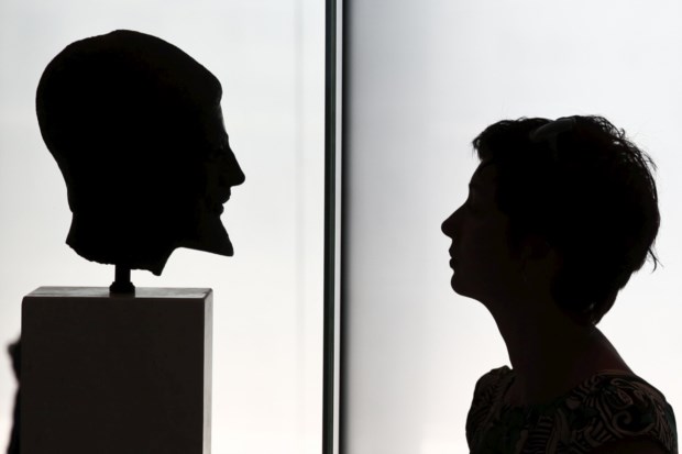 GRÉCIA, 13.08.2013. Uma visitante encara a cabeça em bronze de um hoplita (soldado da Grécia Antiga) no museu da Acrópole, em Atenas Yorgos Karahalis/Reuters