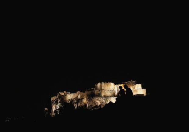 GRÉCIA, 14.08.2013. As silhuetas de um par de turistas contra detalhe da Acrópole em Atenas Yannis Behrakis/Reuters