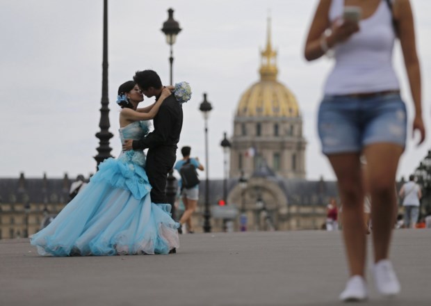 FRANÇA, 16.08.2013. Um casal na ponte Alexandre III com a Catedral de Saint Louis des Invalides no horizonte Christian Hartmann/Reuters