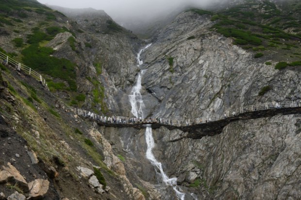 ÍNDIA, 18.08.2013. Peregrinação hindu ao templo da Gruta de Amarnath, em Bairey Marg. A cada ano, milhares de peregrinos percorrem os mais indómitos caminhos pelas montanhas de Caxemira para chegar à gruta, localizada a 3857m de altitude. Na gruta, uma estalagmite de gelo com uma forma fálica simbolizando o deus Shiva é motivo de devoção Tauseef Mustafa/AFP