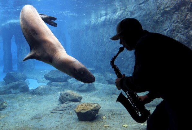 AUSTRÁLIA, 19.08.2013. Steve Westnedge toca o seu saxofone para Casey, uma foca-leopardo, como parte de um estudo da reacção de animais a diferentes sons. No Zoo de Sydney David Gray/Reuters