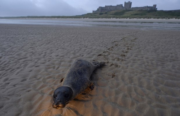 ESCÓCIA, 23.08.2013. Uma foca bebé em regresso ao mar em frente do castelo de Bamburgh Toby Melville/Reuters