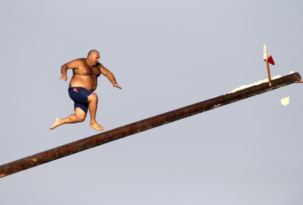 MALTA, 25.08.2013. Um homem corre pela "gostra", um pau coberto de gordura. Objectivo, claro, apanhar a bandeirinha sem cair. Durante as festas religiosas de São Julião, perto de La Valetta Darrin Zammit/Reuters