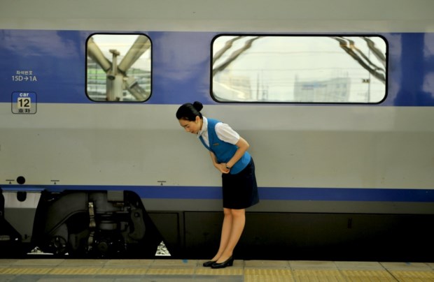 COREIA DO SUL, 28.08.2013. Uma assistente de bordo do comboio saúda os passageiros que chegam à estação de Seul Truth Leem/AFP