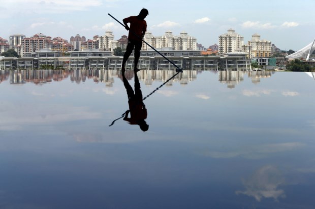 MALÁSIA, 9.10.2013. Um trabalhador limpa uma piscina na mesquita Tuanku Mizan Zainal Abidin em Putrajaya Samsul Said/Reuters