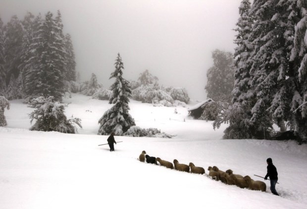 ALEMANHA, 11.10.2013. A conduzir o rebanho pela neve perto de Garmisch-Partenkirchen e Mittenwald, após grandes nevões. Michaela Rehle/Reuters