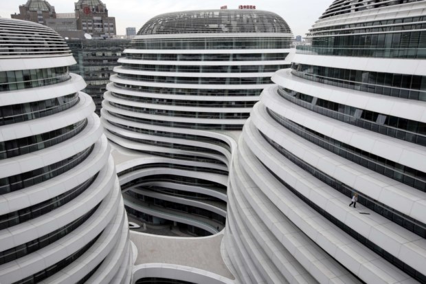 CHINA, 14.10.2013. A nova geometria chinesa. Um trabalhador limpa o chão de um nível deste novo complexo de escritórios e lojas em Pequim. Kim Kyung-Hoon/Reuters