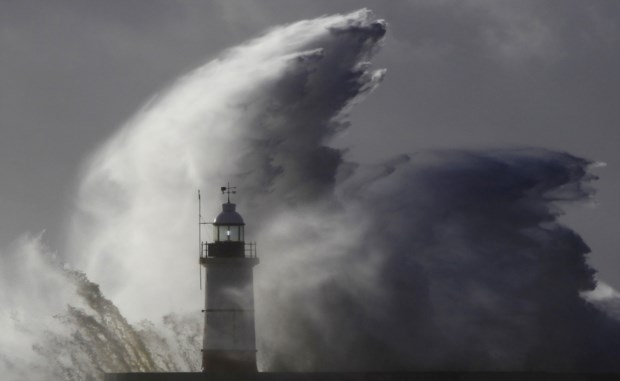 INGLATERRA, 28.10.2013. Ondas gigantes sobre um farol em Newhaven Luke MacGregor/Reuters