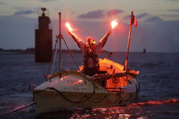FRANÇA, 12.11.2013. A remadora solitária Mylene Paquette, do Canadá, celebra a chegada ao porto de Lorient, na Bretanha, depois de 140 dias no mar, tornando-se a primeira mulher a atravessar sozinha a remos o Atlântico. Stephane Mahe/Reuters
