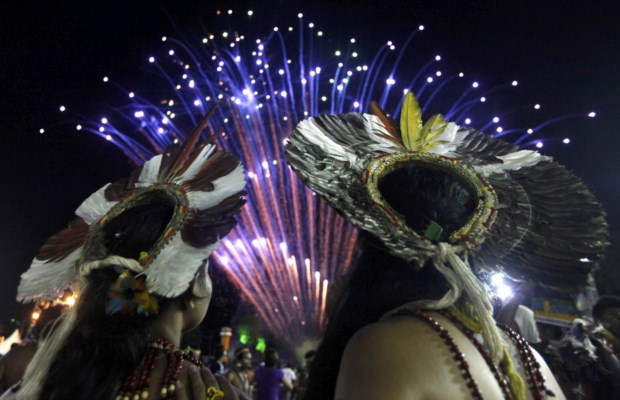 BRASIL, 16.11.2013. Cidadãos indígenas do Brasil observam os fogos-de-artifício nas cerimónias de encerramentos dos XII Jogos do Povo Indígena, em Cuiabá Paulo Whitaker/Reuters