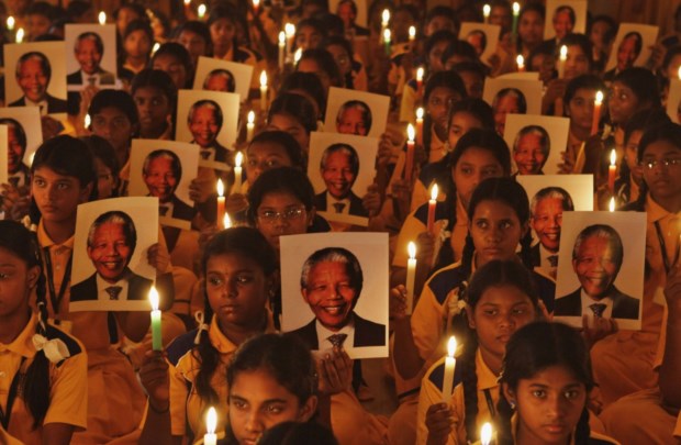 ÍNDIA, 6.12.2013. As homenagens a Nelson Mandela após a sua morte foram planetárias. Aqui, um exemplo local na Índia: crianças da escola primária seguram retratos de Mandela durante uma cerimónia em Chennai Babu/Reuters