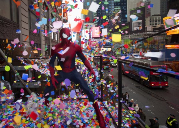EUA, 29.12.2013. Um "Homem-Aranha" posa para fotos durante a parada e chuva de confetti em Times Square, Nova Iorque Carlo Allegri/Reuters
