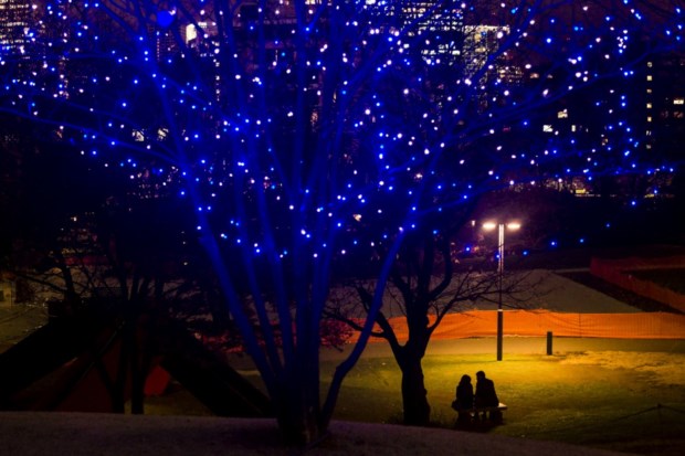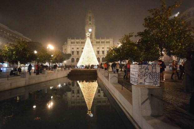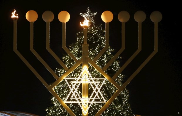 Alemanha, Berlim,.Uma "menorah" gigante em frente de uma árvore de Natal marca o Hanukkah nas Portas de Brademburgo. Fabrizio Bensch / Reuters