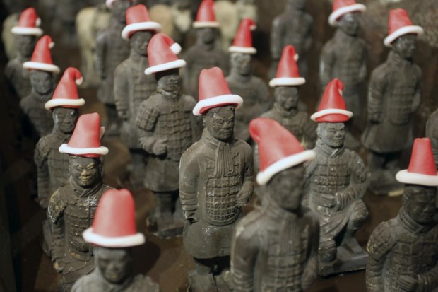 China, Réplicas dos Guerreiros de Terracota em chocolate com chapéus natalícios num hotel de Xi'an, Shaanxi Reuters