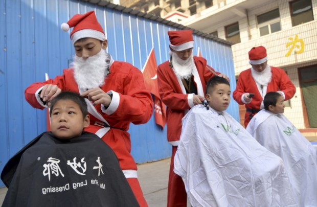 China, Handan. Voluntários vestidos de Pai Natal cortam o cabelo de rapazes de um centro de apoio Reuters