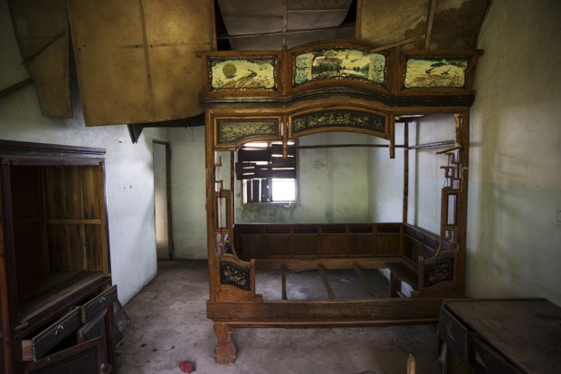 Uma cama e outros móveis foram deixados num quarto de um pequeno apartamento na vila abandonada Damir Sagolj/Reuters