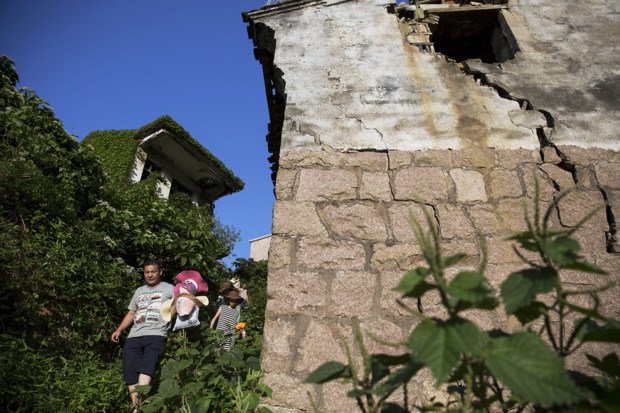 Uma turistas espreita para uma casa abandonada em Houtouwan Damir Sagolj/Reuters