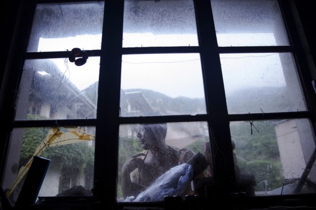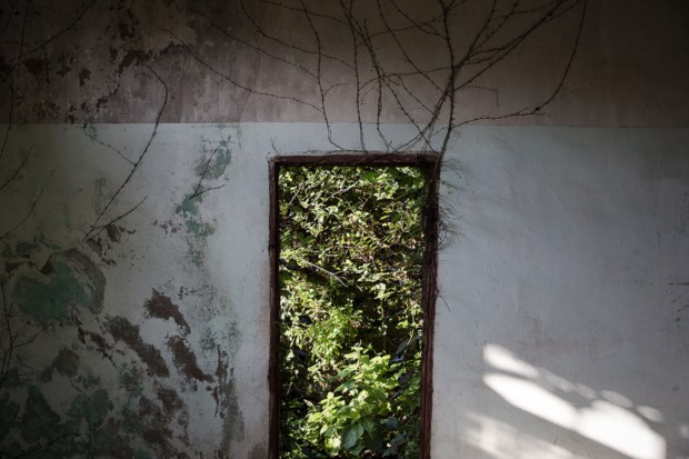 Um edifício coberto de vegetação é fotografado através das janelas partidas de uma casa vazia Damir Sagolj/Reuters