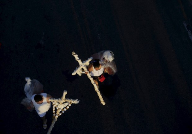 Foliões com adereços caminham para o desfile de Carnaval no Sambódromo, Rio de Janeiro REUTERS/Ricardo Moraes