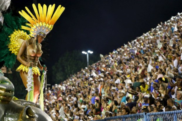 Foliões da escola de samba Unidos da Tijuca durante o desfile de carnaval no Sambódromo, Rio de Janeiro AFP PHOTO / YASUYOSHI CHIBA