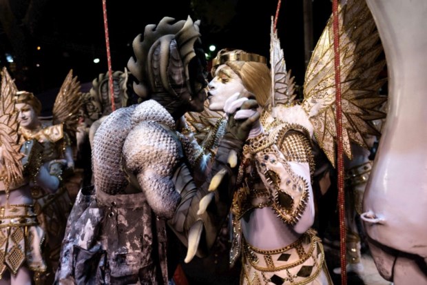 Foliões da escola de samba União da Ilha durante o desfile de Carnaval no Sambódromo, Rio de Janeiro AFP PHOTO / YASUYOSHI CHIBA