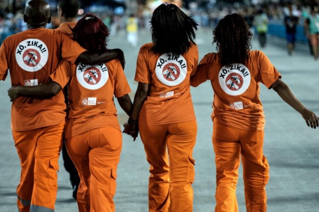 Funcionários da limpeza com camisolas sobre o virus Zika durante o desfile de Carnaval AFP PHOTO / YASUYOSHI CHIBA