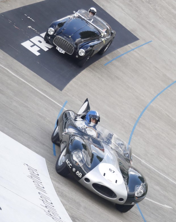Jakob Richi conduz um Jaguar Type D, de 1952, à frente de Louis Frey num Ferrari 340 America Reuters/ARND WIEGMANN