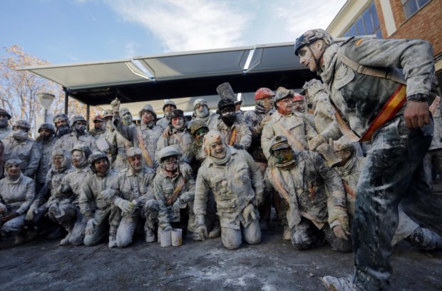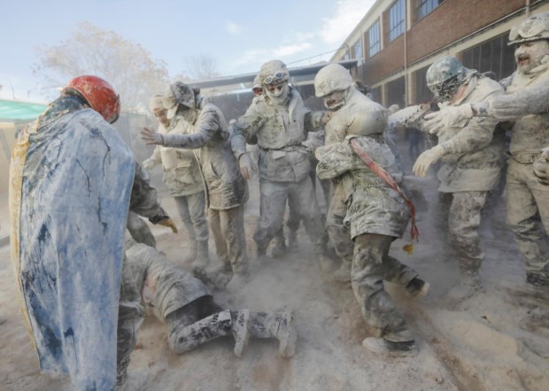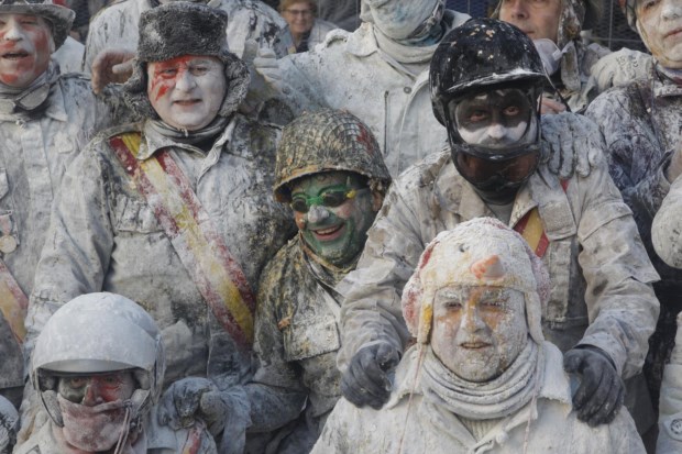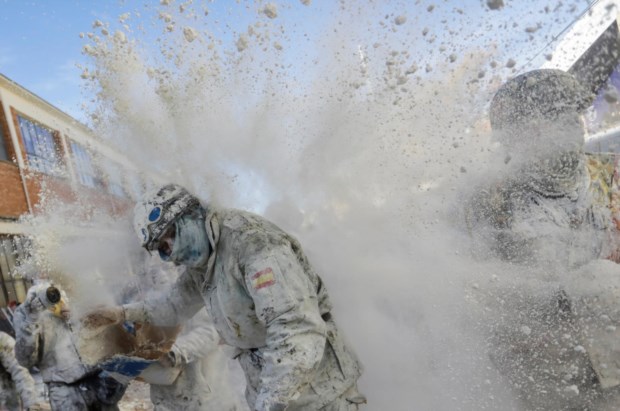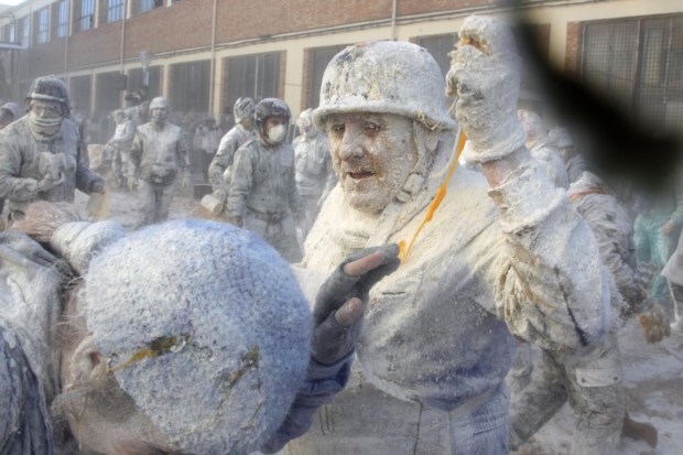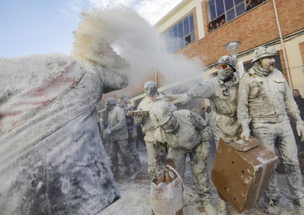 Foliões lutam com farinha e ovos durante o festival tradicional "Els Enfarinats" na cidade de Ibi, província de Alicante, Espanha EPA/MORELL