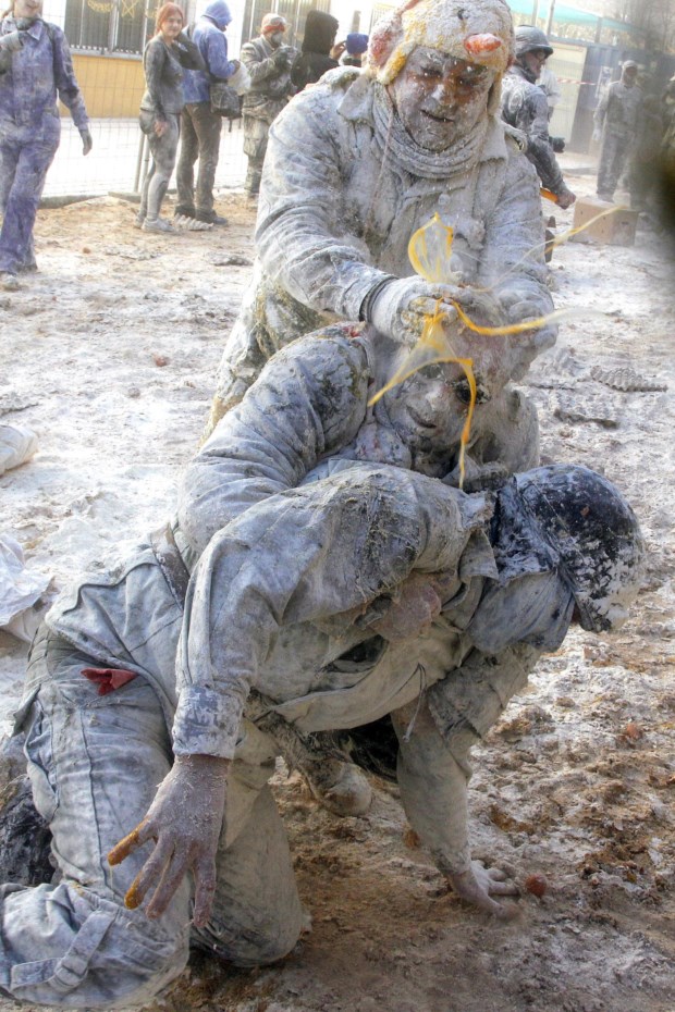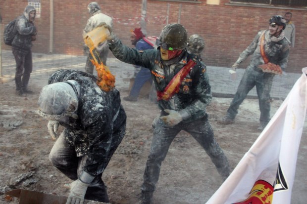 Foliões lutam com farinha e ovos durante o festival tradicional "Els Enfarinats" na cidade de Ibi, província de Alicante, Espanha Reuters/EVA MANEZ