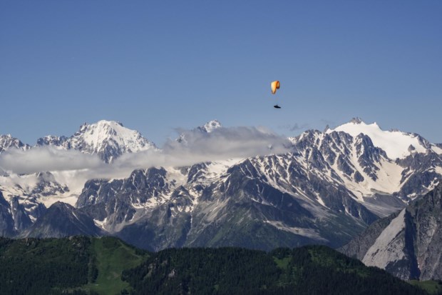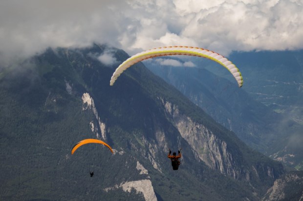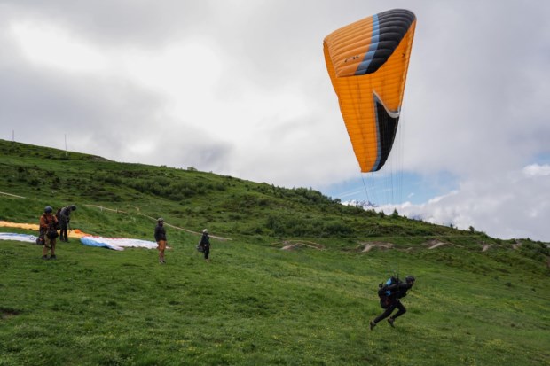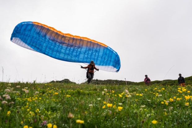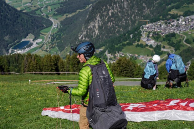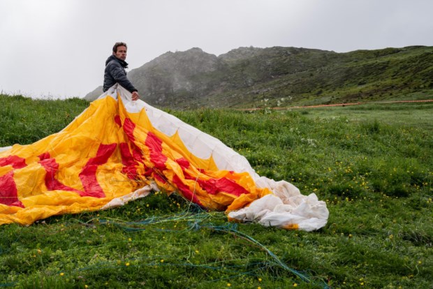 Mike Belbas, co-proprietário da escola de parapente Verbier Summits, no Mont Fort antes de descolar para um voo de treino.Salwan Georges/The Washington Post Salwan Georges/The Washington Post