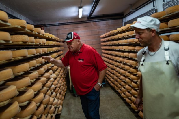 Jonathan e o seu pai, Eddy, inspeccionam alguns dos queijos armazenados numa das salas de processamento da fábrica Laiterie de Verbier. Salwan Georges/The Washington Post