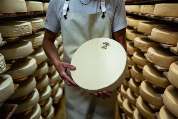 Jonathan Baillifard, queijeiro-chefe da fábrica Laiterie de Verbier, segura um dos queijos armazenados. Salwan Georges/The Washington Post