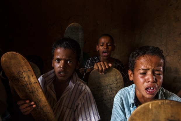 Rapazes numa sala de aula mal iluminada recitam versos de memória numa escola islâmica em Ouadane, Mauritânia. Vencedor portfólio Culturas, Património e Crenças Mitchell Kanashkevich/tpoty.com