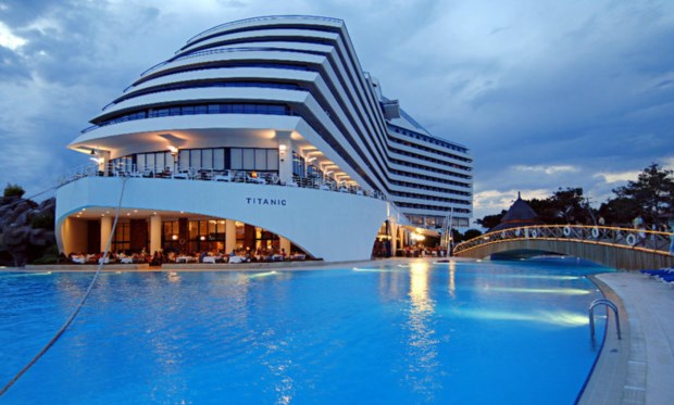 Aqui no novo hotel Titanic, os cenários de época (com sinais de versão cinematográfica, já que a fonte principal é o célebre filme de James Cameron) mesclam-se com confortos e retoques modernos de design. É “cercado por jardins verdejantes com vistas para as águas cristalinas do Mediterrâneo”, resumem. Inclui bares e restaurantes, três piscinas exteriores, spa topo-de-gama, salas de espectáculos. Sendo um tudo-incluído, não admira que se fale de “uma atmosfera animada, com entretenimento de dia e de noite”. Que este é um local onde pairam no ar “oportunidades infinitas de relax e divertimento”.