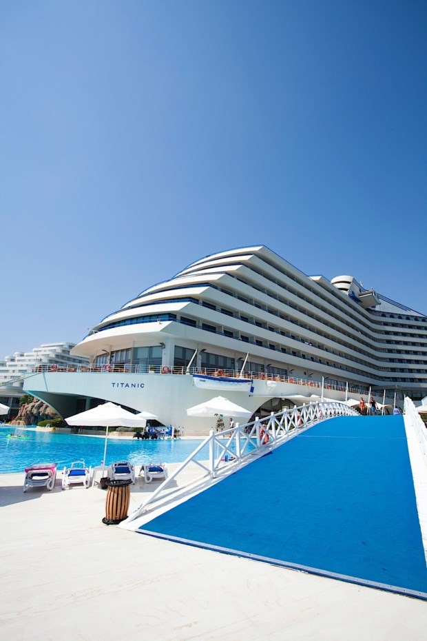 A imagem do edifício central do novo resort não engana, de tão evidente. O Titanic Beach Lara bebeu inspiração de tal modo no malogrado transatlântico que, de certos ângulos, parece mesmo o navio naufragado há 103 anos. Felizmente, para os hóspedes, está em terra, parece bem ancorado, tem o Mediterrâneo aos pés e, à volta, só tem piscinas e jardins. Nenhum icebergue à vista.