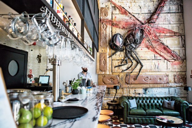 “As janelas foram outra aventura”, continua Marta. Quem se senta hoje no restaurante tem quase uma vista panorâmica do Largo da Intendente e da Almirante Reis — onde, no lado contrário da rua, uma massa de gente enche ao almoço e jantar a entrada da marisqueira Ramiro. As largas janelas que marcam a altura do pé direito são uma novidade. Estavam previstas no projecto inicial, mas nunca se chegaram a materializar. No seu lugar, situavam-se antes gradeamentos metálicos. Em todas as janelas do edifício, aliás, depararam-se com um desafio concreto: respeitar o património, com janelas de madeira, e responder às exigências da actualidade, com isolamento de som. “Felizmente já existem algumas empresas, poucas, que fazem janelas de madeira com a tecnologia actual”, desabafa Marta.