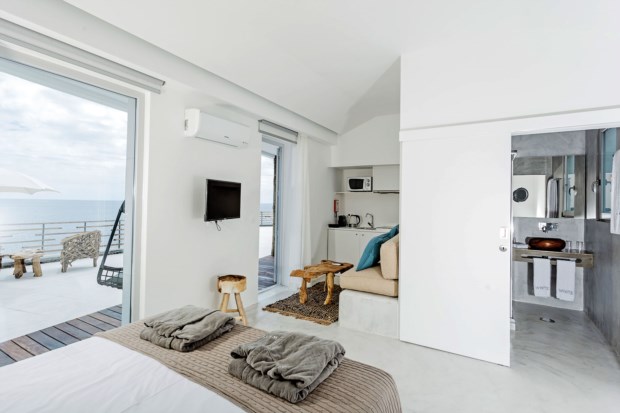 Todos os quartos se debruçam sobre o oceano, com janelas ou varandas. Têm nove suétes e uma villa, entre os 27 e os 42 metros quadrados (e todas com pequenas kitchenettes), porque era fundamental garantir espaços amplos, ao mesmo tempo que se mantém um número reduzido de clientes. “Se não é exclusivo, deixa de ser a nossa casa.”