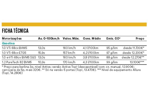 Também é disponibilizada uma versão eco do motor 1.0 VTi, dotada de sistema Start/Stop de paragem e arranque automático do motor. Comum aos três modelos é o facto de só haver motorizações a gasolina, porque os propulsores a gasóleo aumentariam consideravelmente o preço destes citadinos, não compensando uma eventual poupança no combustível. Até porque ambos os motores tricilíndricos a gasolina têm consumos reduzidos, afirmam as marcas.
