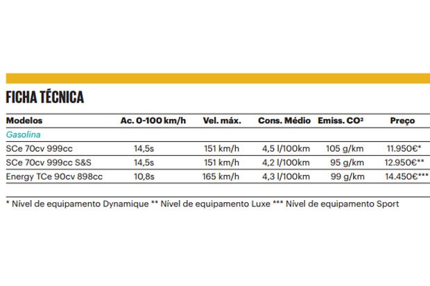 O motor atmosférico tricilíndrico 1.0 a gasolina com 70cv cumpre a norma de emissões Euro 5 sem sistema Start/Stop e a norma Euro 6 com a função de paragem e arranque automáticos do motor. O propulsor turbo 1.0 tricilíndrico de 90cv obedece à norma Euro 6. Segundo o construtor, quaisquer destes propulsores têm baixos consumos e emissões. Todos vêm acoplados a uma caixa manual de cinco velocidades.