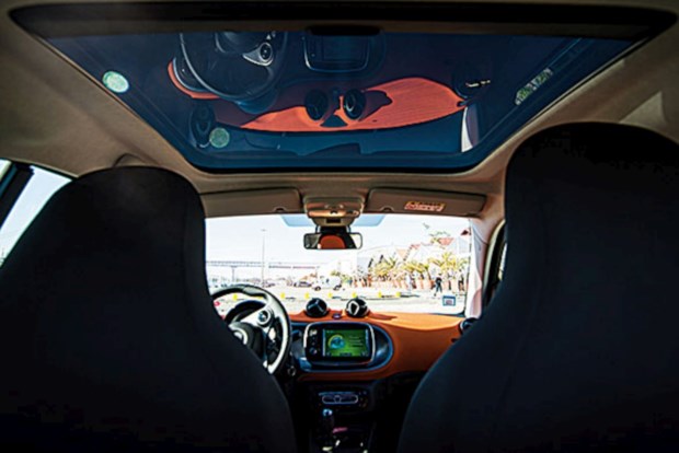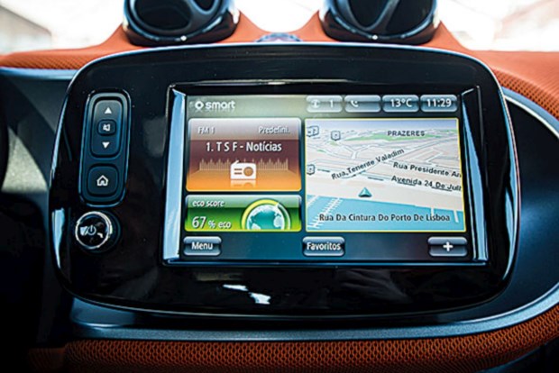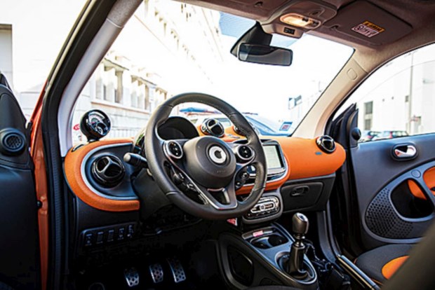 FUN.ctional: é como definem os responsáveis da marca o novo smart e o carrinho, sendo prático e divertido, corresponde à definição. Ao design exterior, que, mantendo o ADN do smart, o tornou mais sofisticado, corresponde um ambiente a bordo jovial, reforçado pelo tecto panorâmico, que lhe adiciona claridade. O modo como foram usados plásticos duros e tecidos de cor viva no habitáculo é um exemplo de como é possível conseguir requinte sem recorrer a materiais caros. A largura adicional proporciona espaço para os dois ocupantes, sendo possível obter uma boa posição de condução com visibilidade para quem quer que se sente atrás do volante. Para além do conta-rotações+relógio analógico e ventiladores sobre o tablier típicos do smart, existe um visor multifunções atrás do volante e um ecrã táctil ao centro do tablier com diversas informações: pode, por exemplo, ter uma configuração tripartida com identificação da estação de rádio, do índice de economia em percentagem (eco score, com base em três parâmetros, aceleração, condução defensiva e engrenar) e do mapa do GPS.
