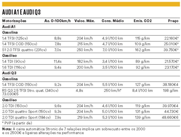 A Audi renovou o seu modelo mais pequeno, o A1, na versão de três portas e de cinco portas (Sportback). Além de pequenas alterações no visual e no equipamento, a gama de motores é totalmente nova, com destaque para os económicos 1.4 TFSI COD (cylinder on demand) de 150cv a gasolina e o diesel 1.4 TDI tricilíndrico de 90cv. Já o SUV Audi Q3 teve os motores modificados para se tornarem mais potentes e eficientes e pequenas alterações no visual. As versões renovadas dos A1 e Q3 já estão disponíveis.