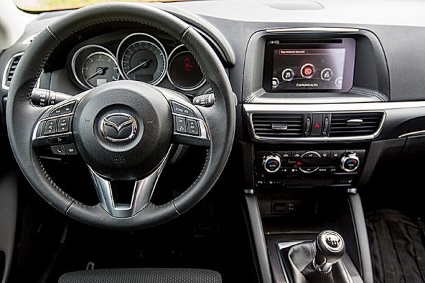 No interior também são bem visíveis as mudanças. Primeiro, todo o espaço está mais limpo e sóbrio, primando pela eficiência. A própria marca chama a atenção para a melhoria efectuada ao nível dos bancos, que, constatámos, oferecem um bom apoio, mas é de sublinhar sobretudo o trabalho ao nível das suspensões. É preciso uma grande alteração no traçado para que se sinta desconforto dentro do carro. Quer à frente quer atrás. Aliás, refira-se que no banco traseiro três conseguem arranjar posição suficientemente agradável, mas apenas dois terão uma viagem sem mácula. Além disso, a Mazda conseguiu aumentar os vários espaços de arrumação pelo habitáculo, a começar pela consola central, onde um pequeno botão substitui o travão manual, permitindo a inclusão de novos compartimentos de arrumação.