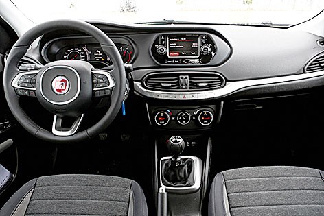 Conduzimos um Fiat Tipo com o nível superior de equipamento, Lounge, e a motorização mais potente, 1.6 a gasóleo de 120cv. Este motor revela-se adequado para deslocar os 1345kg de peso deste veículo, reagindo com rapidez nas acelerações e recuperações ao pisar do acelerador. É fácil encontrar uma boa posição de condução e a visibilidade é boa. Refira-se que, para quem gosta, que é possível regular o banco do condutor para uma posição baixa, mais comum em veículos desportivos. Em cidade, o Fiat Tipo dispõe do modo de condução City, que torna a direcção mais leve e facilita as manobras. A caixa manual de seis velocidades é de fácil accionamento. O consumo médio oficial é 4,2 l/100km. Num percurso com cerca de 150km obtivemos uma média de 5,9 l/100km. Há, porém, que ressalvar que fizemos essencialmente condução em cidade e o carro era novo, pelo que é expectável a obtenção de médias a rondar os 5,0 l/100km. Refira-se que o Tipo não dispõe de sistema Start/Stop de paragem e arranque automáticos do motor.