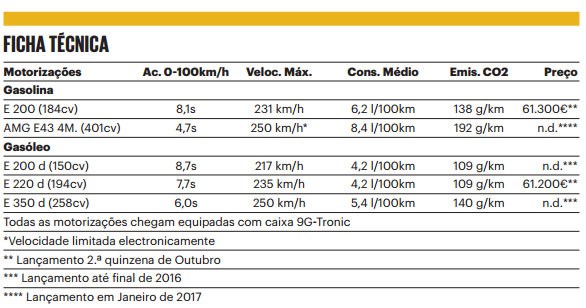 A classe E Station estará disponível a partir da segunda quinzena de Outubro com dois motores: E200, 1991cc, a gasolina de 184cv (61.300€) e E220 d, 1950cc, a gasóleo de 194cv (61.200€). Até ao final do ano virão mais motorizações a diesel: E 200d (150cv) e E 350 d (258cv).