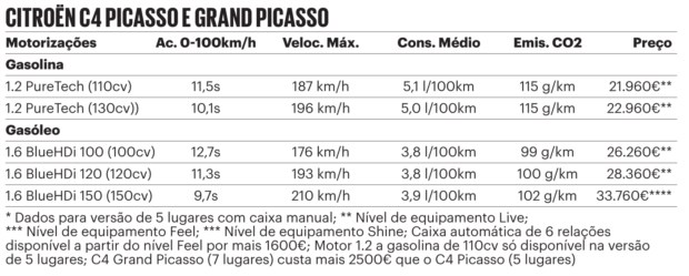 No que se refere a motorizações, há duas variantes do motor tricilíndrico de 1199cc a gasolina, com 110cv (apenas na versão de cinco lugares) e 130cv. A gasóleo, o bloco de 1560cc é proposto com 100, 120 e 150cv. A caixa automática é opção, por mais 1600€, a partir do nível Feel (os níveis de equipamento são três: Live, Feel e Shine) para os propulsores 1.2 PureTech de 130cv e 1.6 Blue HDi de 120cv. Os 1.2 de 110cv a gasolina e 1.6 HDi diesel de 100cv vêm com caixa manual de cinco velocidades e apenas com o nível Live; para os outros propulsores a caixa manual tem seis velocidades. Os preços começam nos 21.960€ do C4 Picasso 1.2 PureTech a gasolina de 110cv Live e nos 26.260€ do 1.6 HDi diesel de 100cv Live, ambos de cinco lugares. A Grand Picasso, tem preços a partir dos 25.460€ na versão Live 1.2 a gasolina de 130cv e dos 28.760€ com o bloco 1.6 HDi a gasóleo de 100cv e equipamento Live.