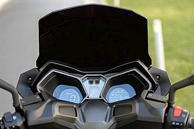 O comportamento em estrada e nas vias rápidas é suficiente. O ecrã elevado oferece uma protecção razoável e o avental dianteiro cobre bem as pernas, atingindo com facilidade os 90 km/h — e até um pouco mais quando o declive ajuda. Em estrada sinuosa é um prazer cumprir quilómetros, com as suspensões a digerirem o encadeado de curvas sem obrigar a particular esforço ou atenção. Para o passageiro é também uma boa experiência, e gosta do que se lhe reserva, usufruindo de um lugar amplo e confortável, com as pegas ao longo do assento a permitirem que cada um escolha o melhor local para se agarrar.